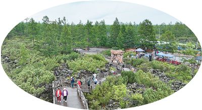 游客在內蒙古阿爾山國家森林公園石塘林景區游玩。