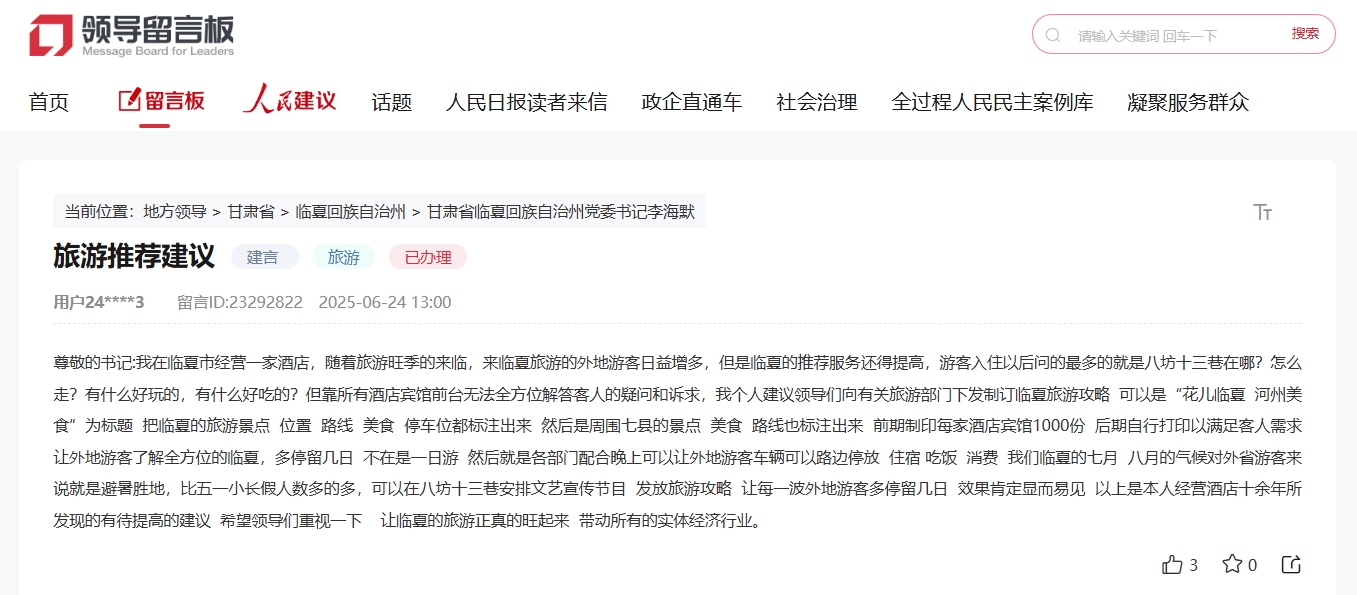 人民網蘭州7月18日電 (記者米媛)“文旅部門可編制《花兒臨夏 河州美食》臨夏旅游官方攻略在全市酒店發放,把臨夏市區及周邊七縣的旅游景點位置、路線、美食在攻略中標注出來,相關部門也應允許夜間時段,讓外地游客的車輛能在指定區域停放,還可以在八坊十三巷安排文藝節目”……近日,甘肅臨夏網友通過人民網“領導留言板”就如何依托臨夏夏季避暑優勢,讓外地游客全方位了解臨夏,吸引游客從“一日游”轉向“多日停留”給出意見建議。