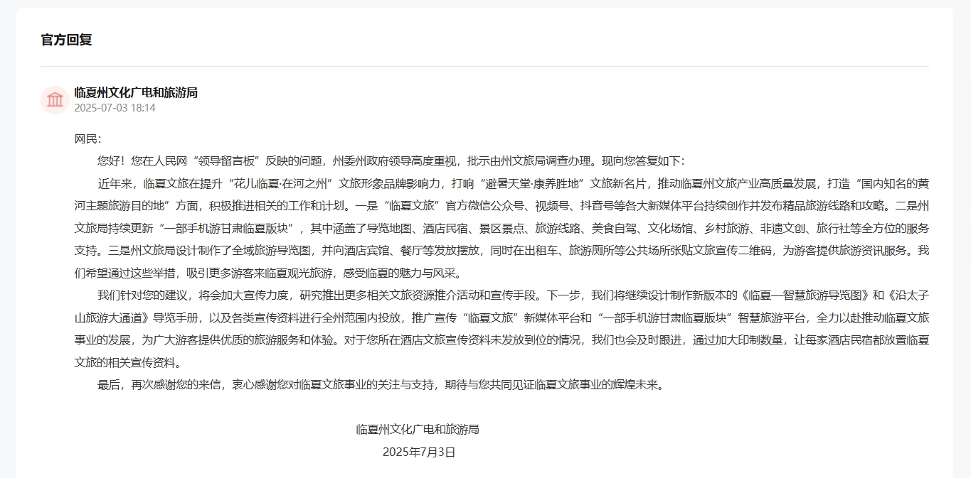 收到留言后,臨夏州委州政府高度重視。臨夏州文化廣電和旅游局在回復中表示,近年來,臨夏文旅在提升“花兒臨夏·在河之州”文旅形象品牌影響力,打響“避暑天堂·康養勝地”文旅新名片,推動臨夏州文旅產業高質量發展,打造“國內知名的黃河主題旅游目的地”方面,積極推進相關工作和計劃。