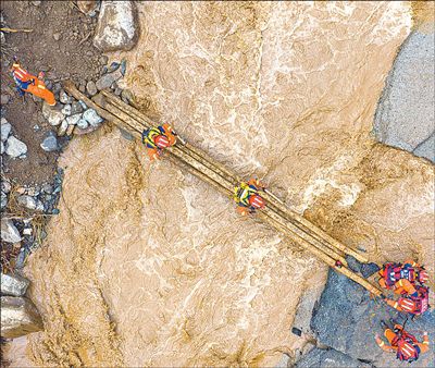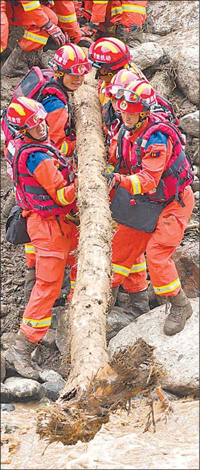 約20分鐘后,4根由石塊和繩索固定的樹干并列橫跨在湍急的水流上,一座臨時木橋成型。消防救援人員踩過木橋,繼續踏泥前行……
