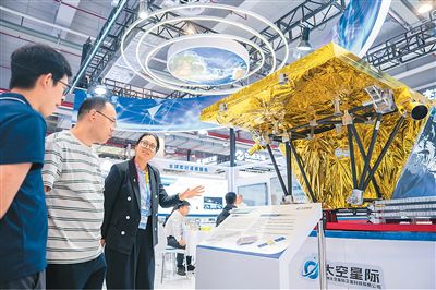 在株洲國際會展中心,工作人員(左三)在介紹一臺對地觀測衛星。