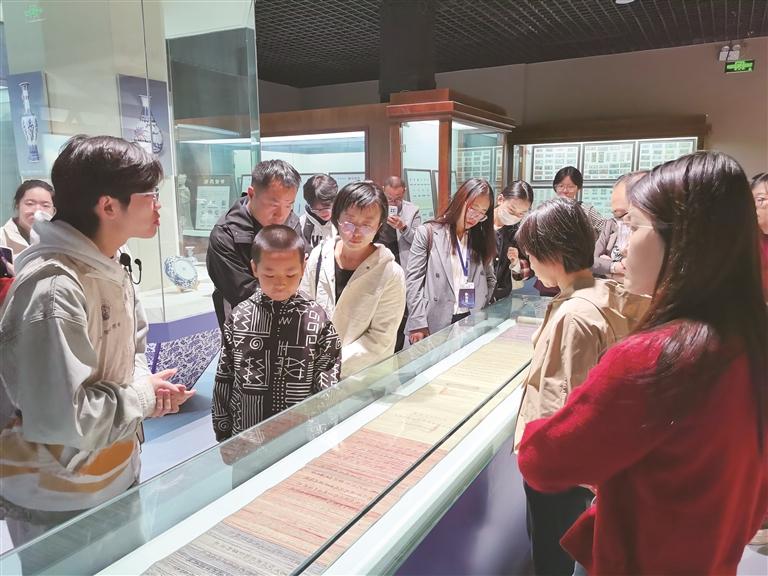 西北師范大學星火館內學生志愿者為參觀者認真講解